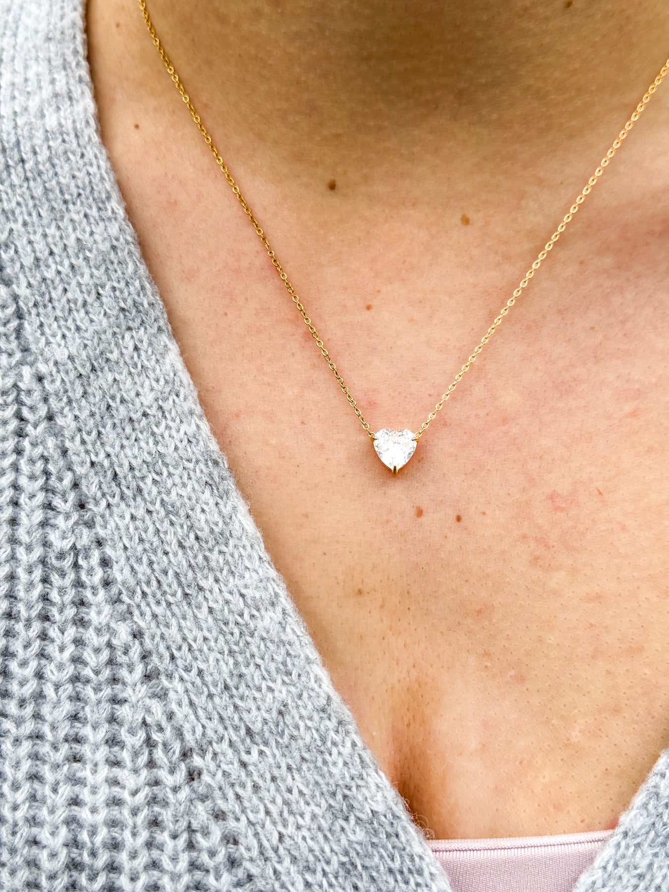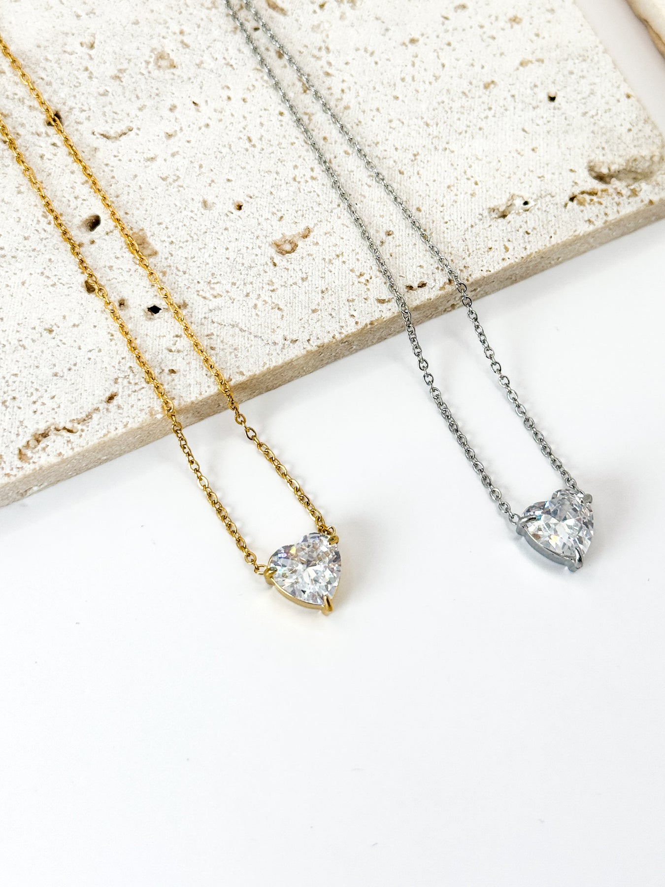 Den klare zirkon-facet fanger lyset smukt, og hjertet hviler elegant på den fine kæde.